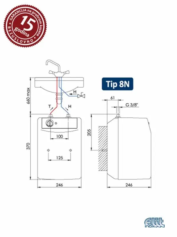 Malolitražni bojler TALAS 8 poseduje prohromski kazan zapremine 8 litara.